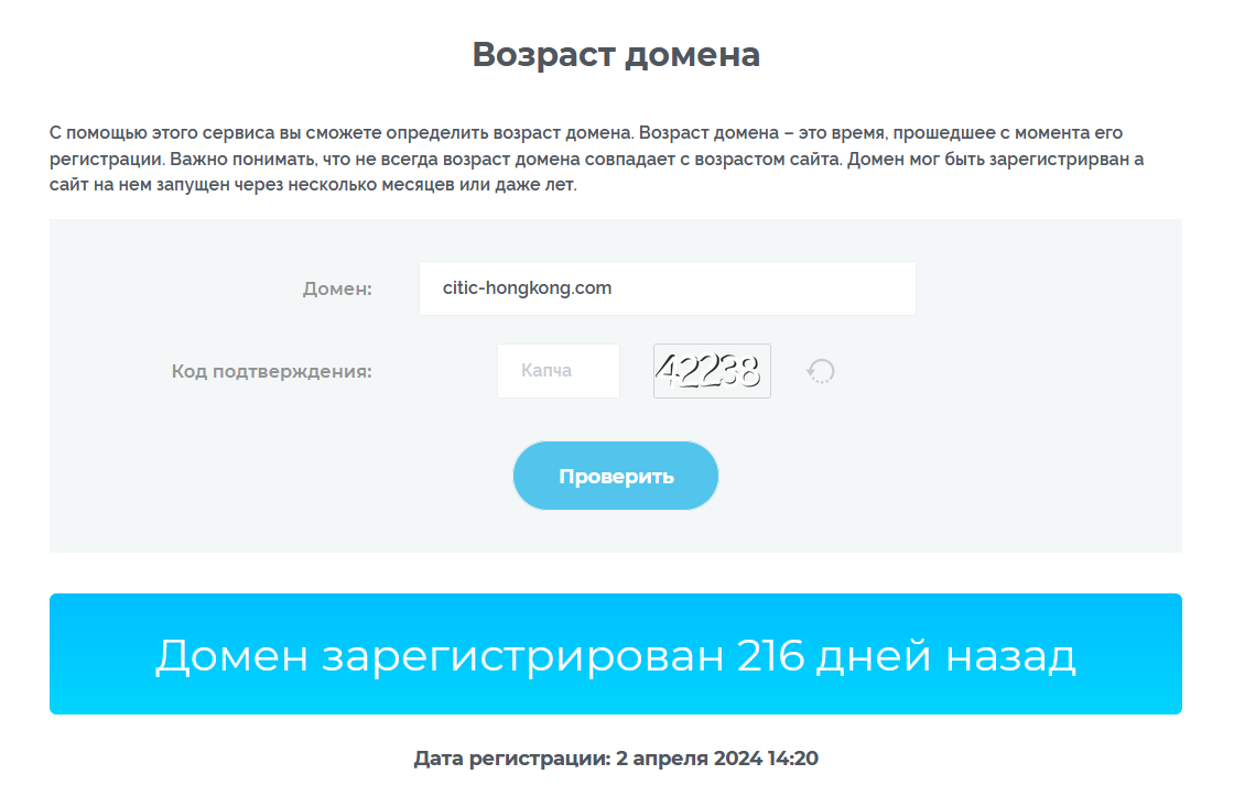 Citic Capital (citic-hongkong.com) представляет собой типичный пример брокерской компании, созданной с целью мошенничества. Домен был зарегистрирован всего 216 дней назад, что вызывает серьезные сомнения в его надежности, и основная задача этого проекта — присвоение средств пользователей. За короткий срок этот скам-брокер успел накопить множество отрицательных отзывов, что не удивительно. Компания тщательно скрывает информацию о себе, что является еще одним основанием, чтобы держаться от нее подальше.